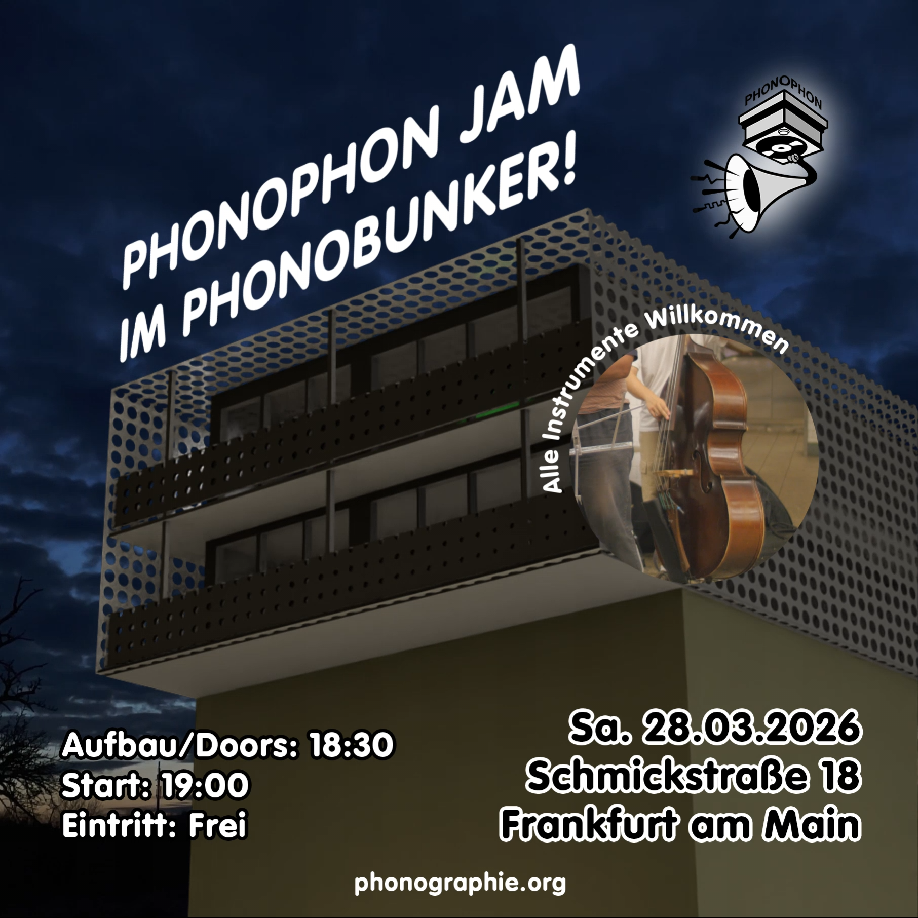 Liebe Freundinnen und Freunde von Phonophon, unsere Jam-Reihe startet in wenigen Tagen endlich ins neue Jahr. Egal, ob mit analogen oder elektronischen Instrumenten, mit der eigenen Stimme, manipuliertem Kinderspielzeug, selbst Gebautem oder teuer Erkauftem: Kommt zum Jam und lasst uns gemeinsam Musik machen. Falls ihr analoge Klangerzeuger mitbringt, würden wir euch bitten, auch ein Mikrophon und bei Bedarf auch einen Mikrophon-Ständer im Gepäck zu haben, damit wir euch in den Mixer einspeisen können und ein rundes Klangbild über unsere PA erhalten. Zum Aufbauen könnte ihr gern schon ab 18:30 Uhr auf dem Hochbunker ankommen. Wenn ihr das wunderbare Feld der experimentellen Musik einfach nur erleben wollt, dann laden wir euch ab 19 Uhr ein, den verschiedenen Jams zu lauschen, die sich am Abend bilden werden. Der Eintritt ist frei. Im Kühlschrank halten wir Getränke mit und ohne Alkohol für euch parat. Wir freuen uns auf euer Kommen! Timetable: 18:30 Uhr: Aufbau für Musiker*innen 19:00 Uhr: Start 22:00 Uhr: ca. Ende 31.1.2026 Phonophon @ Hessenfilm, Schmickstraße 18, 60314 Frankfurt Eintritt: Frei Veranstaltungsort Der Eingang zum Dach des Hochbunkers im Osthafen befindet sich auf der rechten Seite des Bunkers gleich neben der Gaststätte "Zur Insel". Durch die offene Tür und das Treppenhaus gelangt ihr auf das Dach des Bunkers. Dort folgt ihr der Außentreppe in den zweiten Stock, wo sich unser Veranstaltungsort befindet. Parkplätze für Autos gibt es vor und hinter dem Bunker. Achtung: Wer auf den Truckerplätzen parkt, riskiert ein Knöllchen. Mit den Öffis geht's am schnellsten mit der Tram-Linie 11 zur Haltestelle "Schwedlerstraße" und dann zu Fuß am Schwedler See vorbei direkt auf den Hochbunker im Osthafen zulaufen.